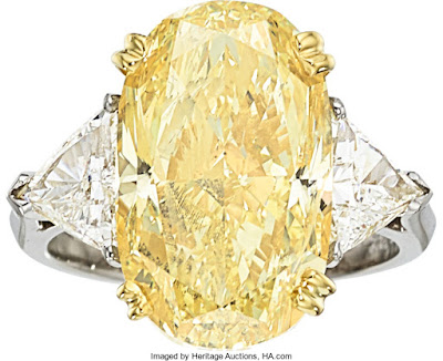 * A 10.45-carat oval modified brilliant-cut fancy yellow diamond measuring mounted on 18k gold, flanked by triangle-shaped diamonds weighing a total of approximately 1.00 carat. Its estimate is $40,000 to $70,000.
