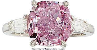 * A 5.04-carat cushion-shaped fancy intense purplish-pink diamond mounted on a platinum ring and flanked by bullet-shaped diamonds. Its estimate is $100 - $150,000.